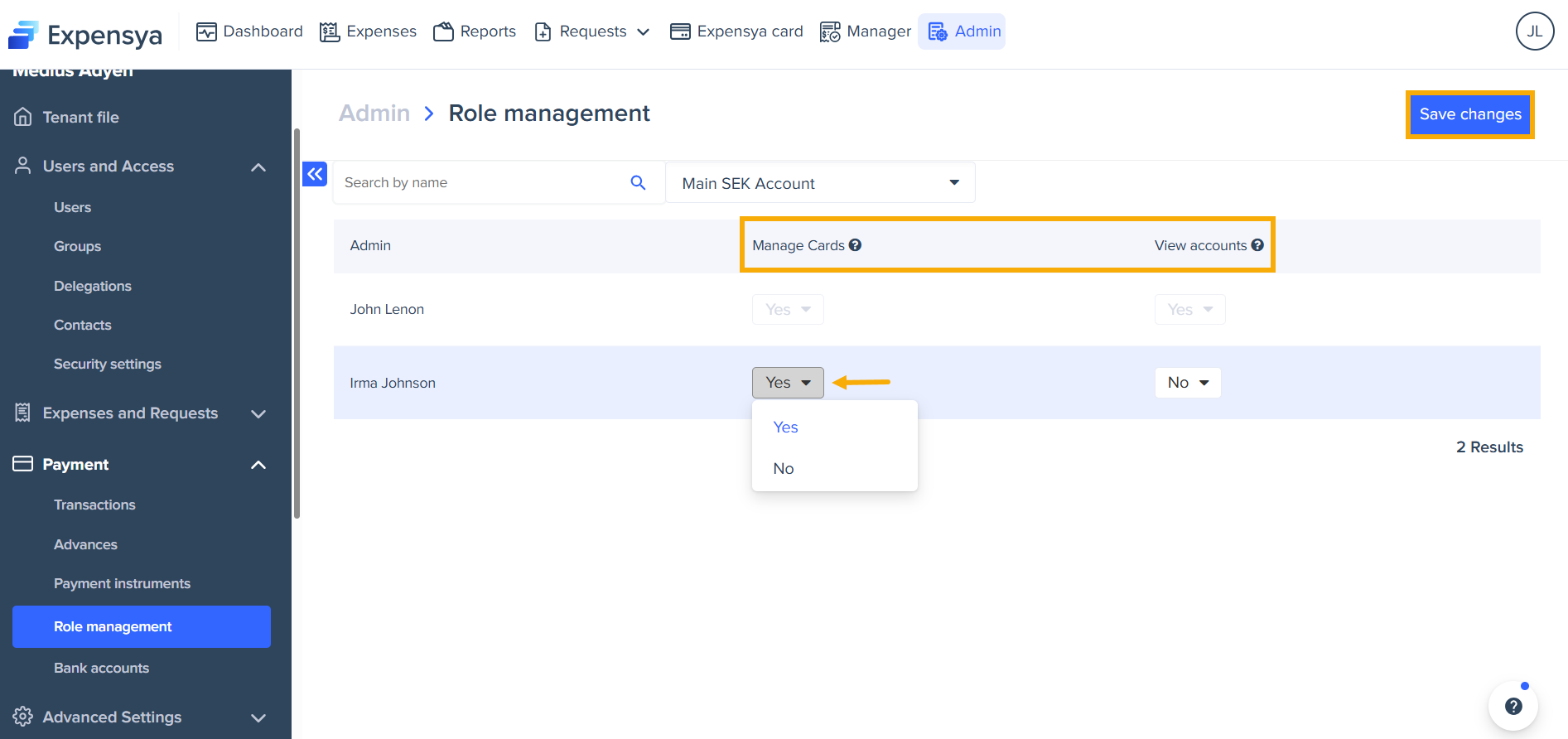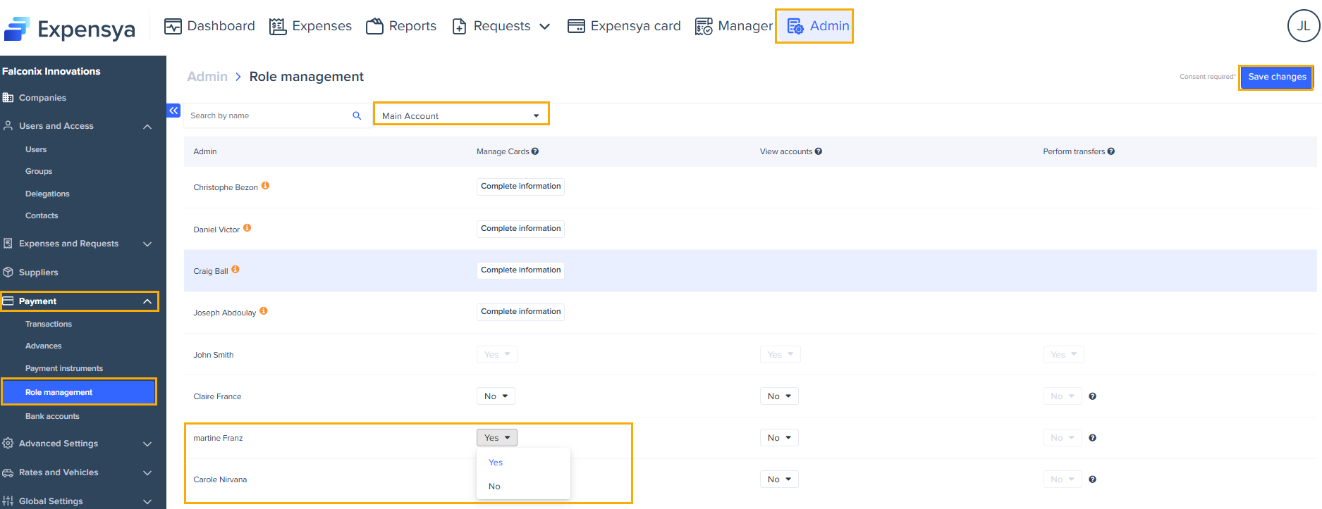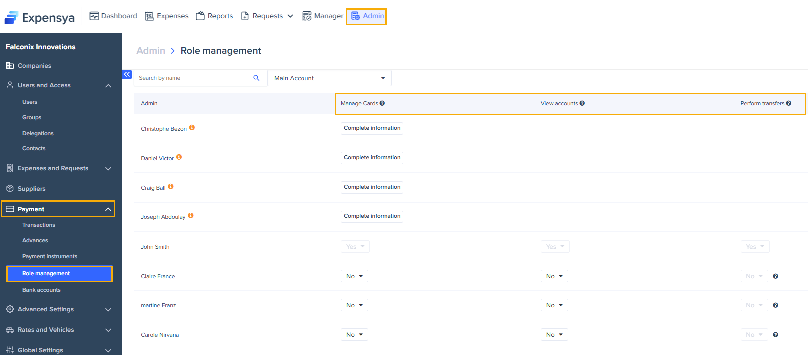 Expensya uses specific roles to control access to card management and payment accounts. These roles can be assigned to administrators.