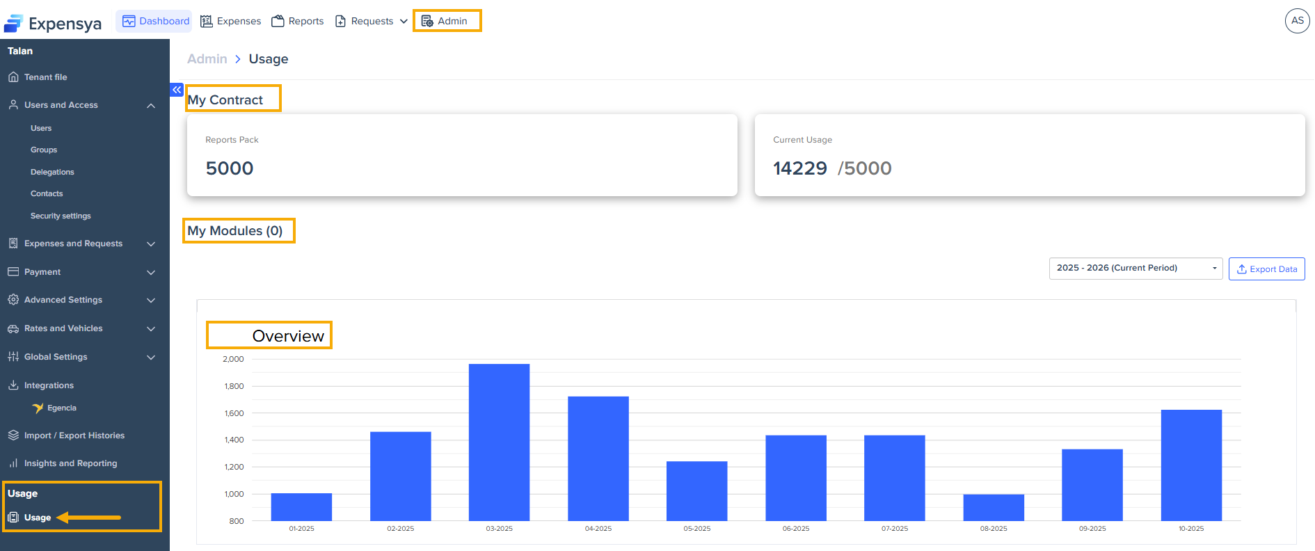 The Usage dashboard centralizes all usage information for companies billed on Report-Count. Accessible from the Admin panel, it provides a clear view of report consumption and purchased modules, helping you manage usage proactively.