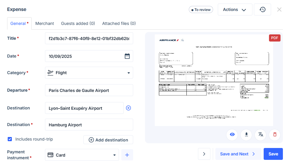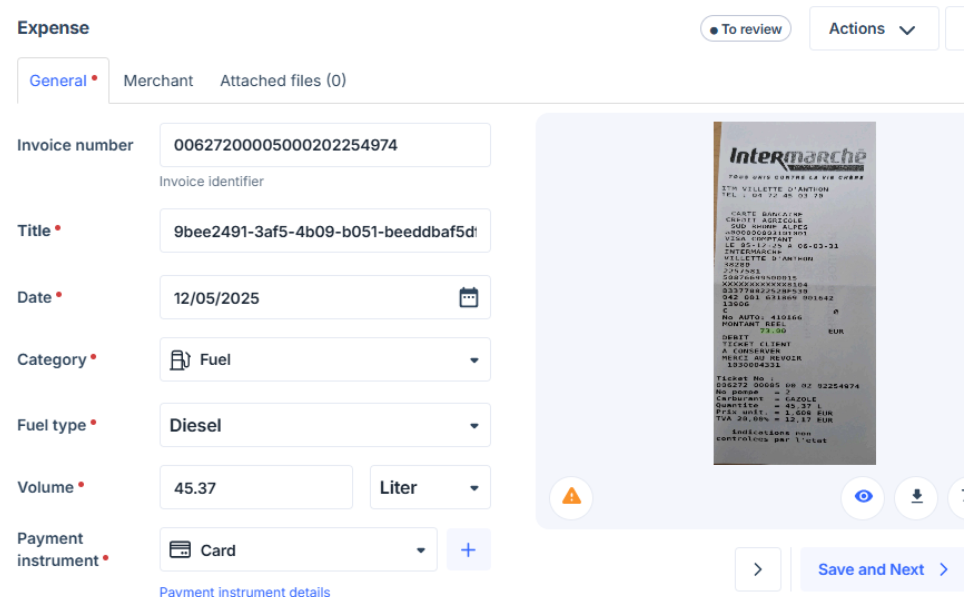 - Employees: Must enter additional data when submitting Transport (flight, train or taxi) or Fuel expenses.