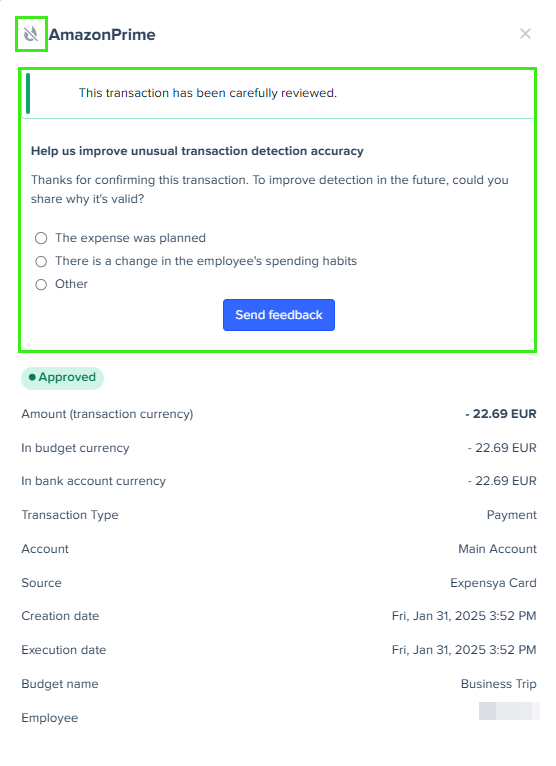 - If a transaction is confirmed as suspicious, no feedback is required. Depending on the situation, you can ask the cardholder for further details on the transaction, close the related budget to block additional spend, suspend the card, or contact the support to request a refund.