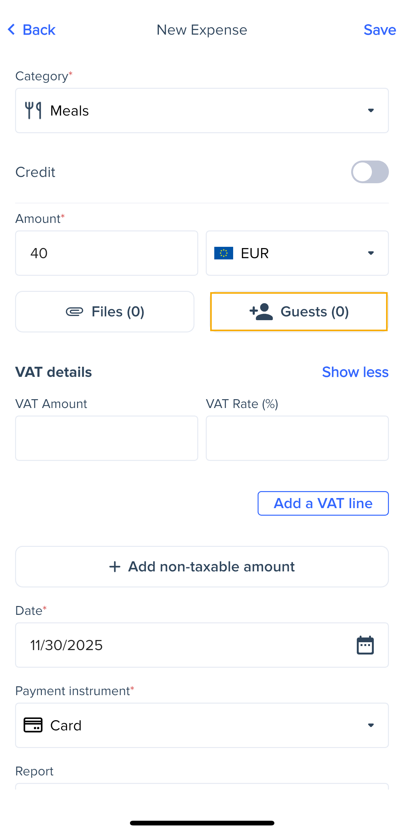 The process is even more straightforward on the Expensya mobile app. All you have to do is add your expense and choose a category. A Guests added option will appear from which you can select one of your contacts.