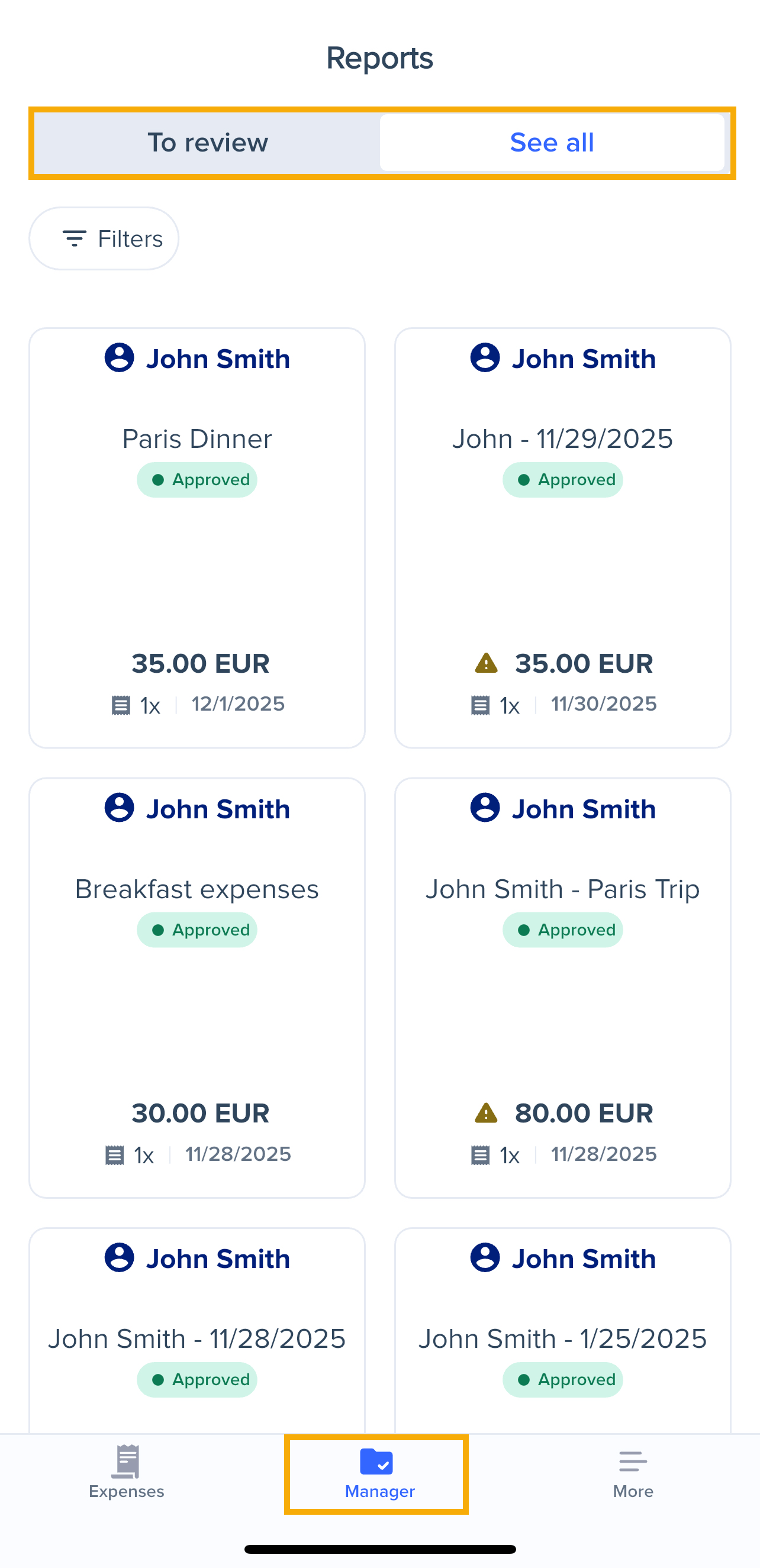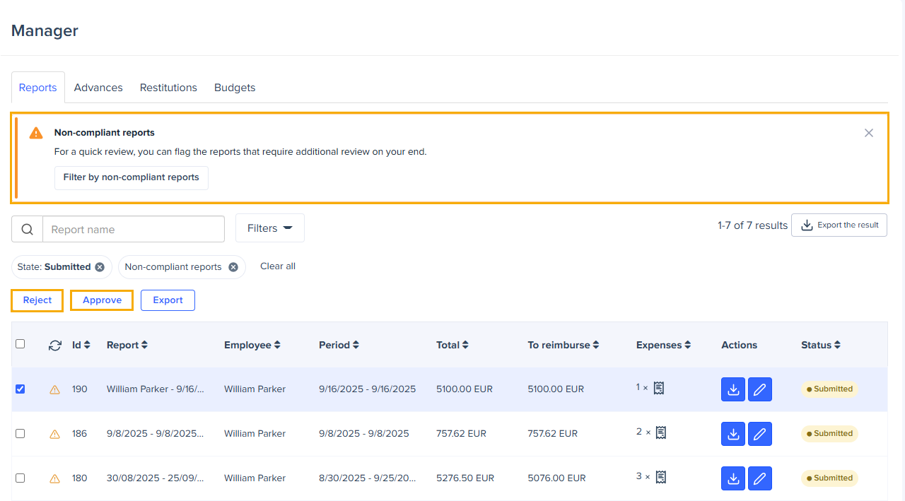 - Select the report to review. Here, the manager has the choice between seeing the expenses assigned to this report or approving/rejecting the entire report in just one click.