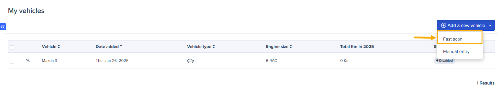 - Click Add a new vehicle, then select the Fast scan option from the dropdown menu.