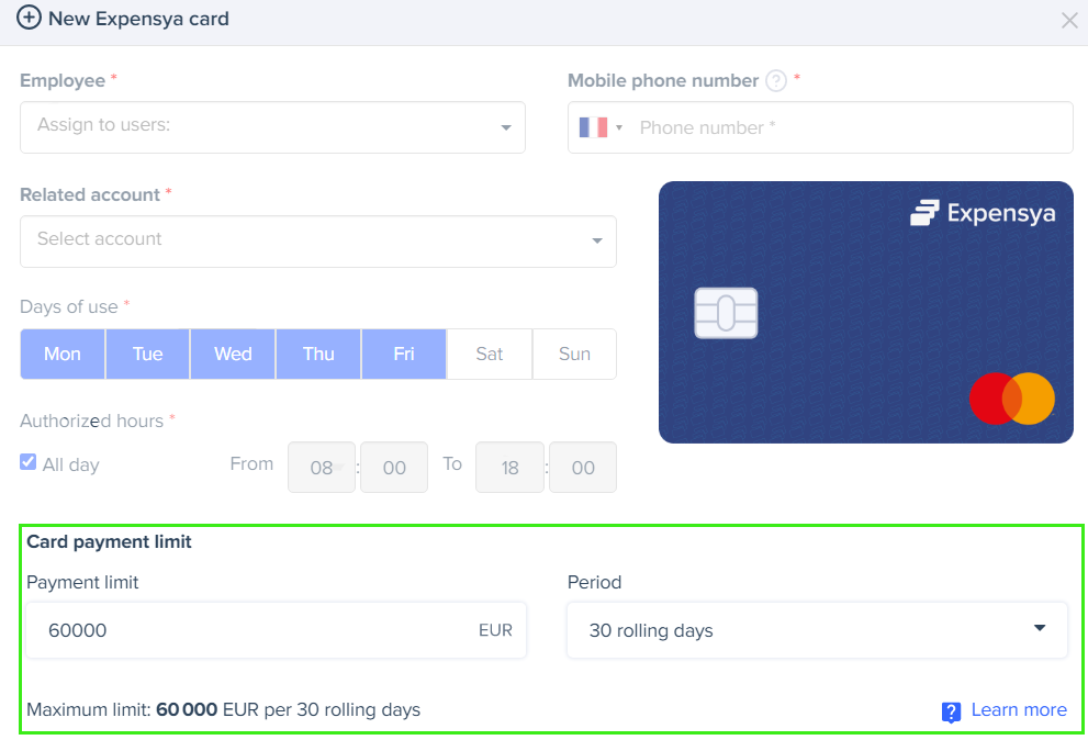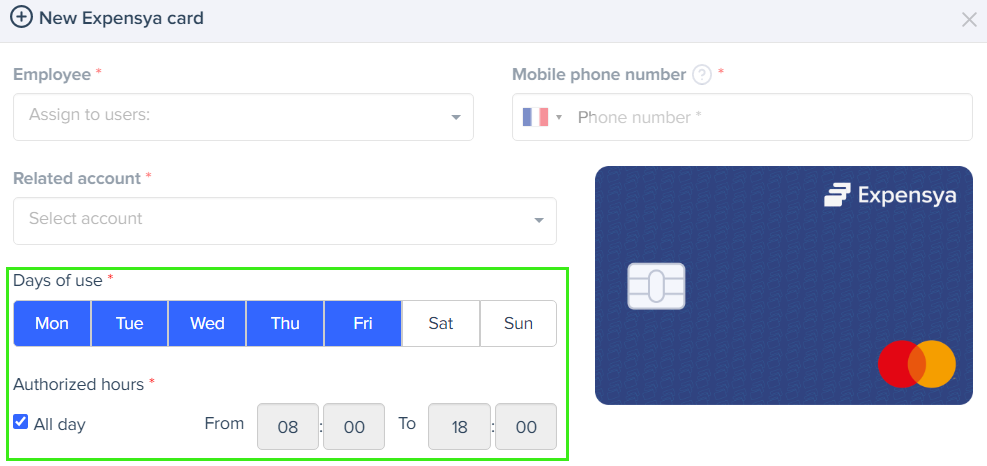 - AllDays - to specify when payments with the Expensya card are allowed during the week.