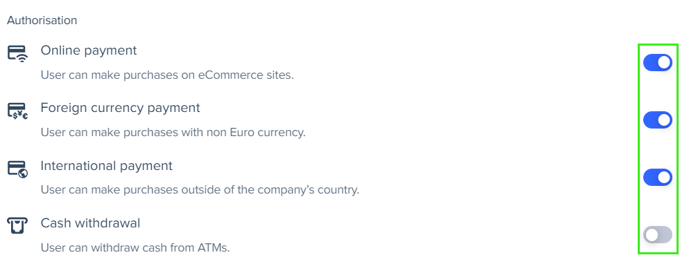 - Authorizations - to specify the allowed expense categories. Enter "All" to authorize all types, or list specific categories separated by commas. Available options: Business and services, Car rental, Flight, Gas station, Hotels, Internet subscriptions, Parking and tolls, Postal charges, Public transport, Restaurants, and Taxi.