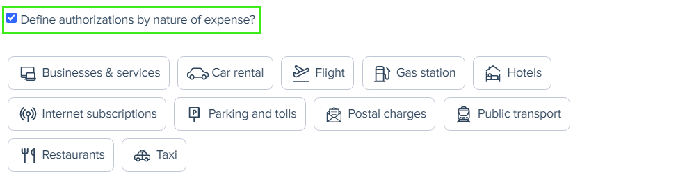 - Select Define authorizations by nature of expense to specify the authorized expense categories (Business and services, Car rental, Flight, Gas station, Hotels, Internet subscriptions, Parking and tolls, Postal charges, Public transport, Restaurants, Taxi).