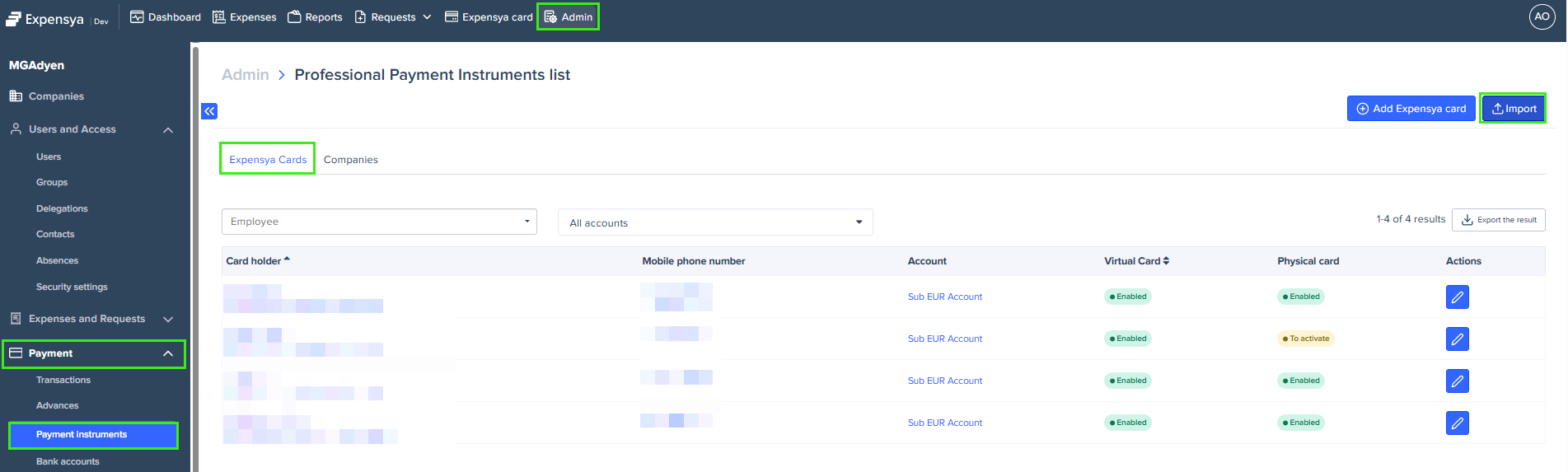 As administrator with the payment role Can manage cards can issue and assign virtual Expensya cards to employees. For more details: Expensya Cards - Administrator Role Management