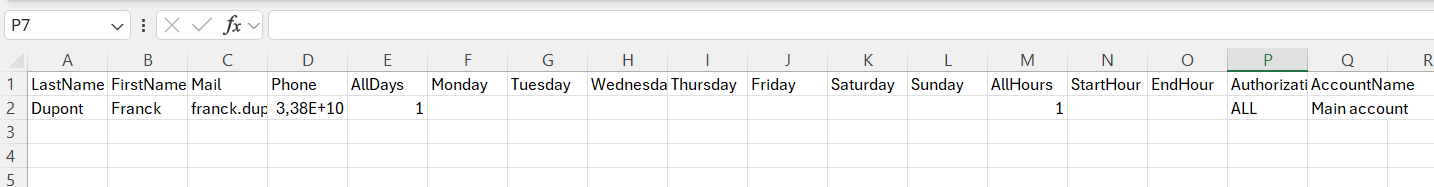 - Phone - the employee's mobile phone number (format: country code+number. For example: +33607070707).