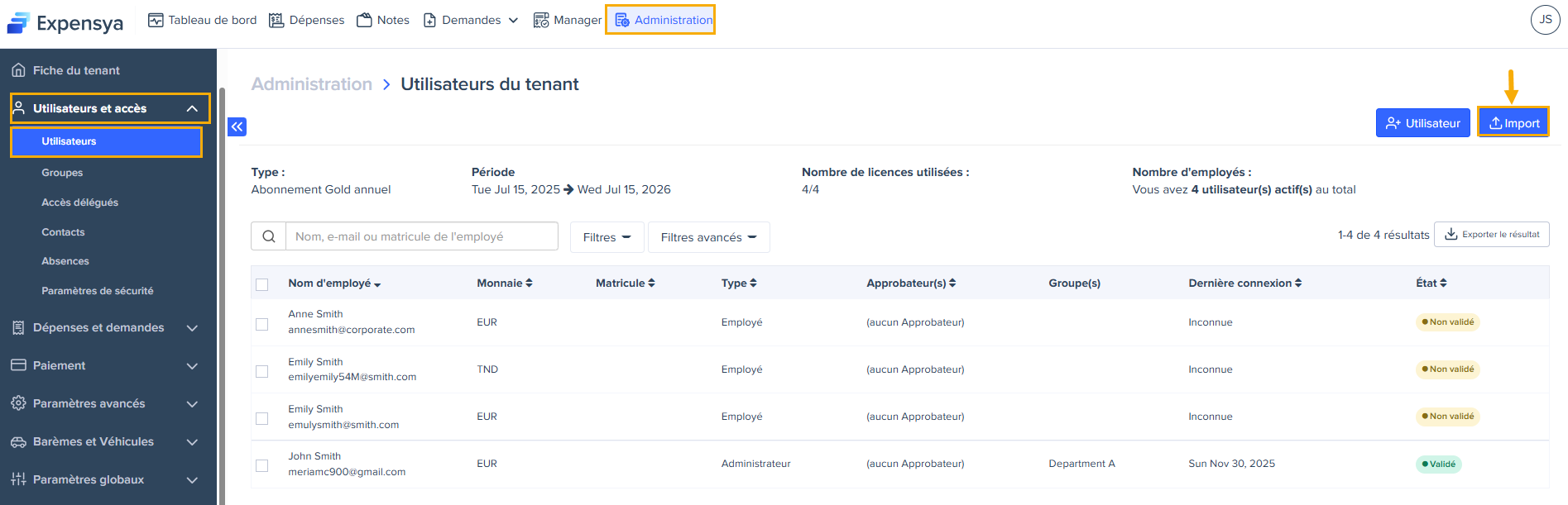 - Importez la nouvelle liste des employés après édition. Dans l'onglet Administration, cliquez sur Utilisateurs et Accès > Utilisateurs > Import.