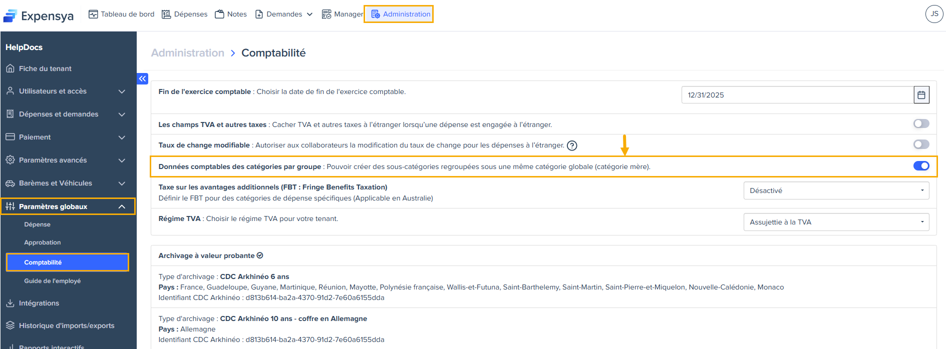 - Activer l’option : Données comptables des catégories par groupe : Pouvoir créer des sous-catégories regroupées sous une même catégorie globale (catégorie mère).