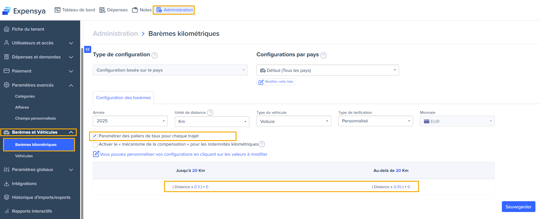 - Cliquez sur l’onglet Administration > sous menu Barème kilométrique