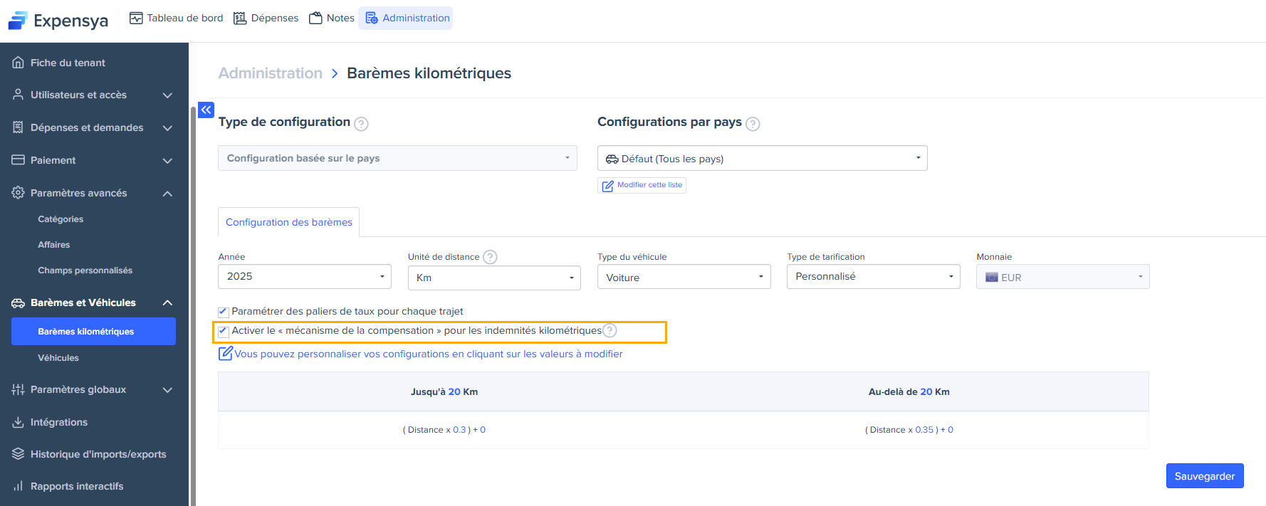 - Sous menu barème kilométrique cochez Activer le "mécanisme de la compensation" pour les indemnités kilométriques.