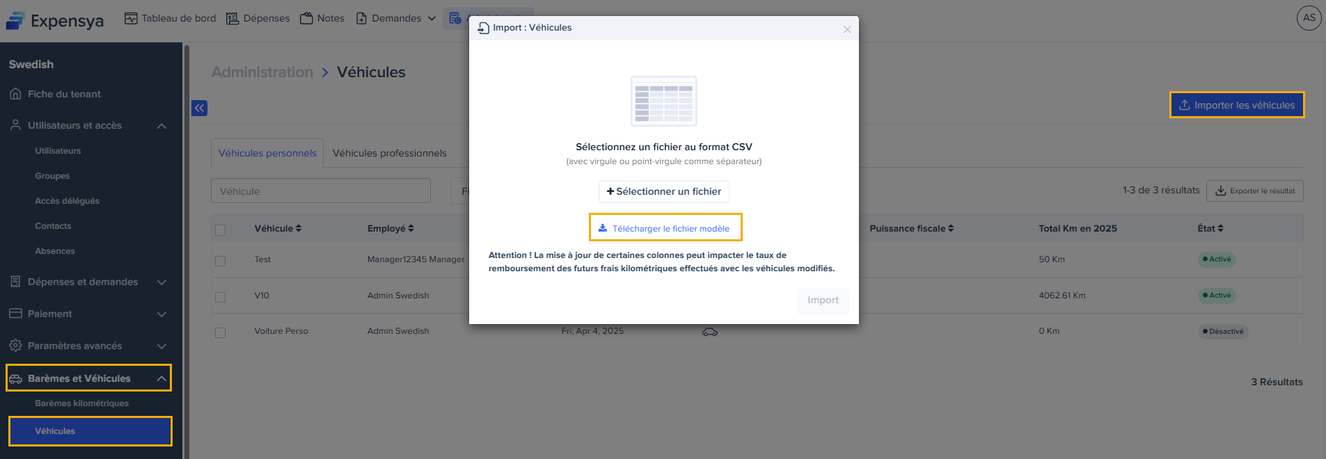 Import des véhicules personnels par l’administrateur