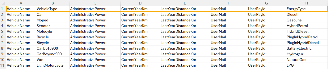 - Energy Type - type d’énergie du véhicule. Les options incluent: Diesel, Gasoline, HybridPetrol, HybridDiesel, PlugInHybridPetrol, PlugInHybridDiesel, BatteryElectric, Hydrogen, NaturalGas, LPG, Biofuel, Other. Notez que la colonne Energy Type peut être configurée par l’administrateur comme obligatoire, optionnelle ou masquée. Si elle est masquée, la colonne n’apparaîtra pas dans le CSV.