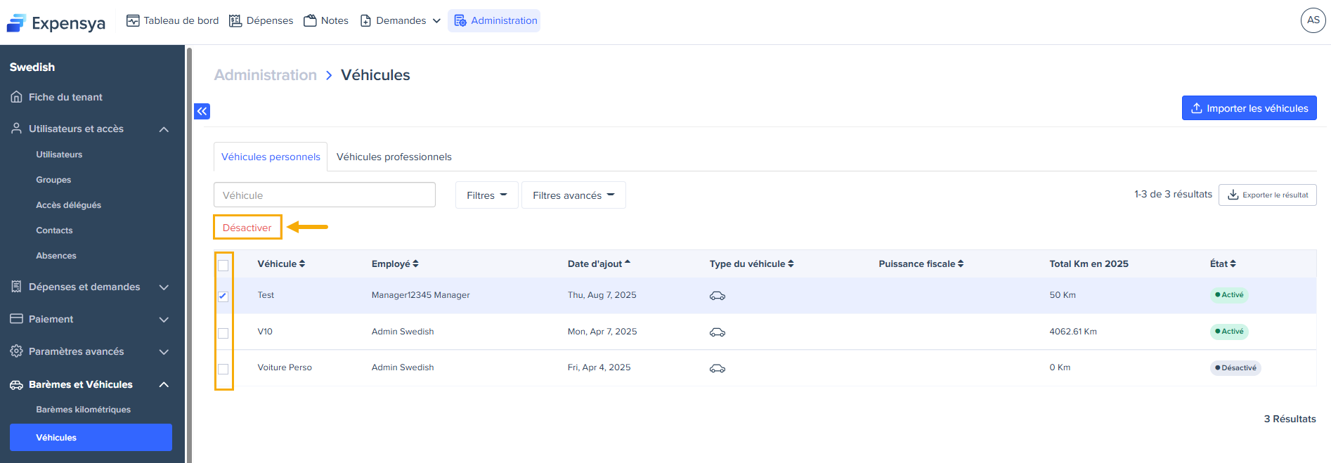 L’administrateur peut désactiver un véhicule dans la liste des véhicules mais ne peut pas le supprimer.