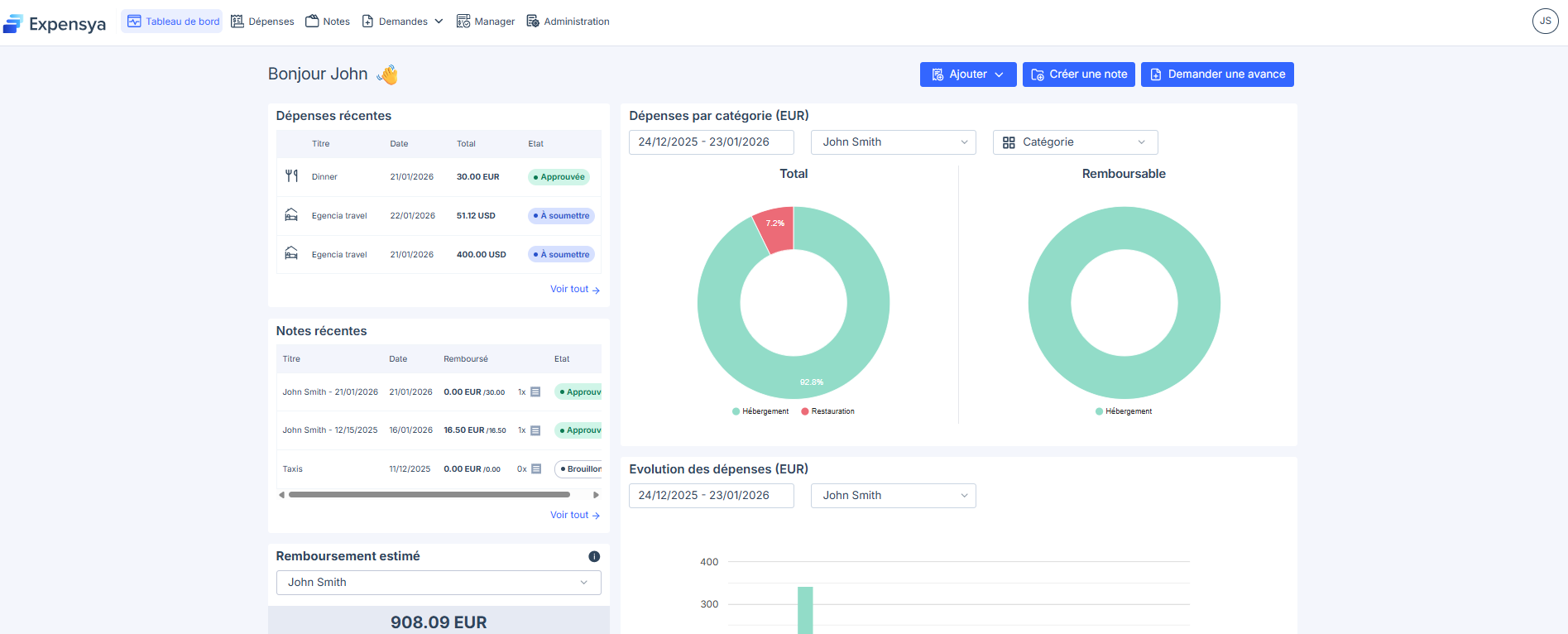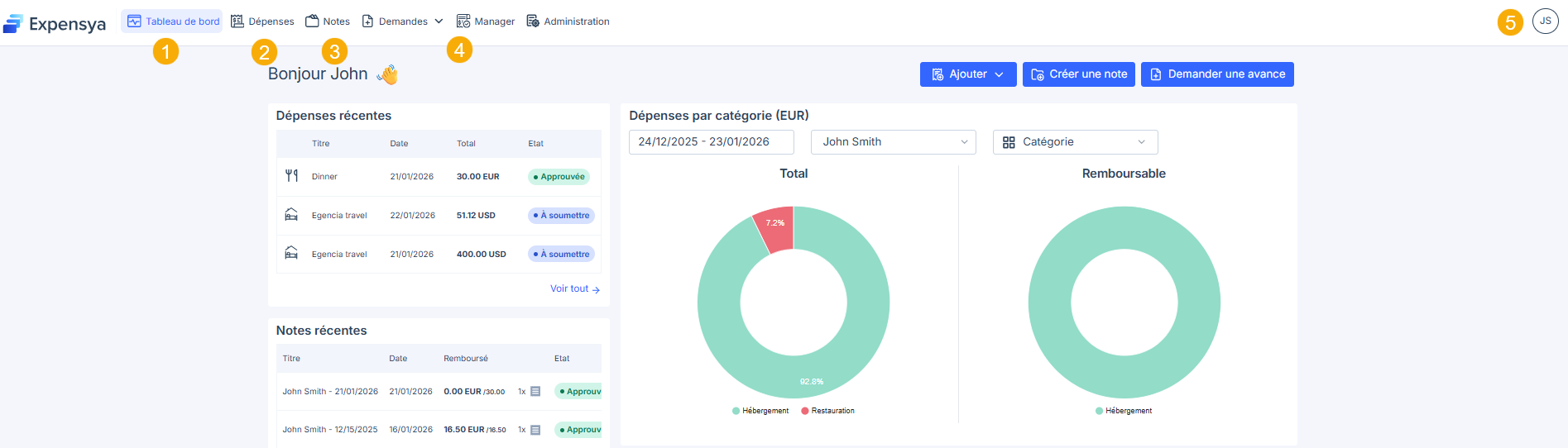 - La page d’accueil s’ouvre et vous présente vos dépenses récentes, vos notes de frais ainsi que des graphiques récapitulatifs.