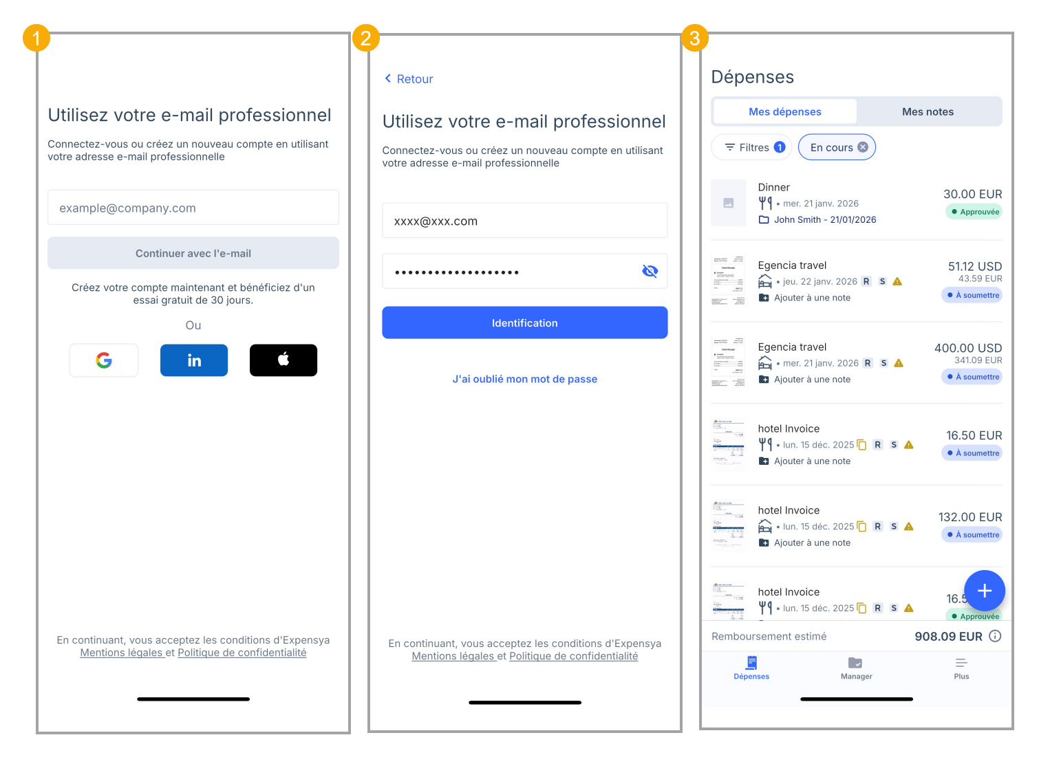 Connectez-vous à l’application mobile pour gérer vos dépenses où que vous soyez. Pour cela, commencez par télécharger l’application Expensya depuis l’App Store ou le Play Store, puis suivez ces étapes: