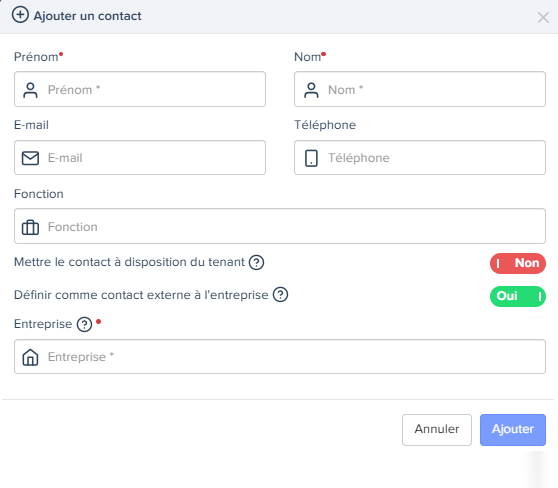 Vous pouvez partager ce contact avec tout le tenant et indiquer s'il s'agit d'un contact externe à votre tenant.