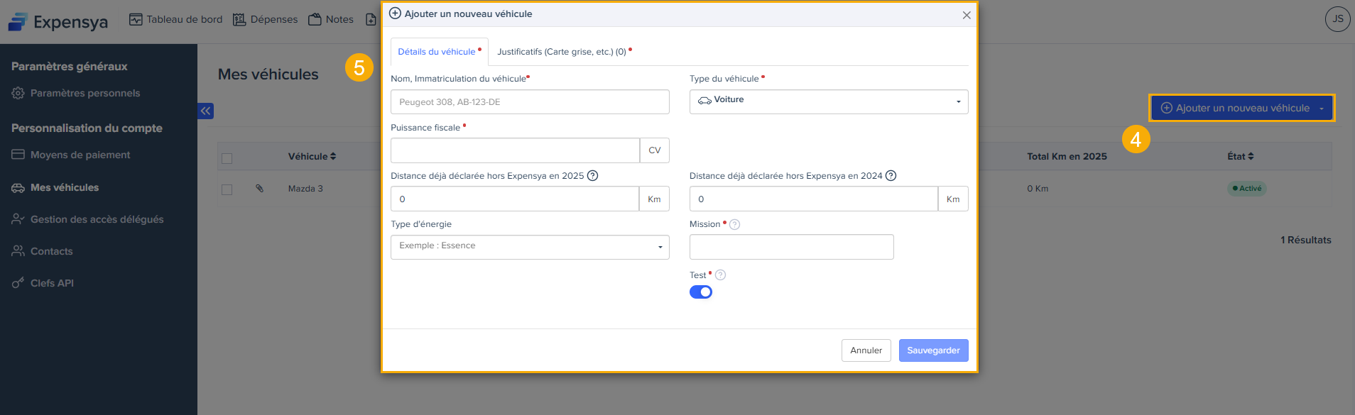 - Si vous avez déjà un véhicule, cliquez sur le bouton + à côté du champ véhicule pour en ajouter un nouveau.
