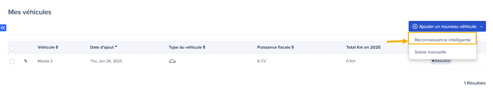 - Cliquez sur Ajouter un nouveau véhicule, puis sélectionnez l’option Reconnaissance intelligente dans le menu déroulant.