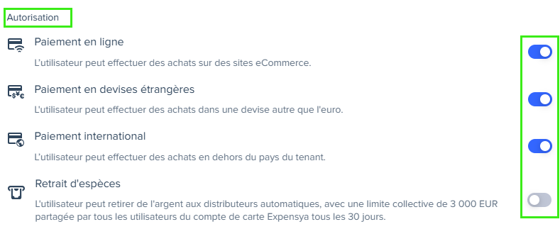 - L'administrateur doit avoir le rôle de paiement Peut gérer les cartes. Plus de détails sont disponible au niveau de : Les cartes Expensya – Gestion des rôles des administrateurs