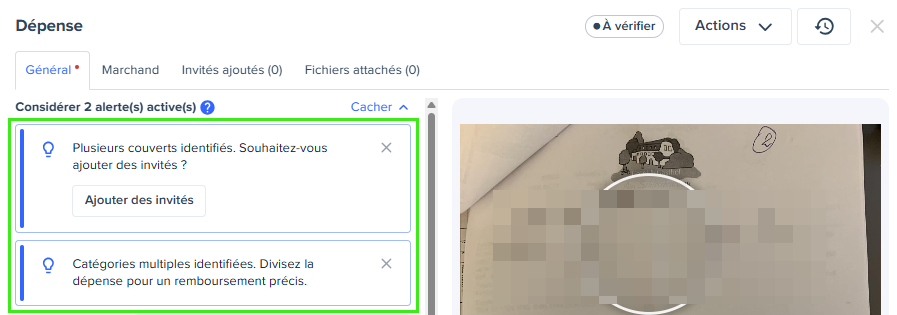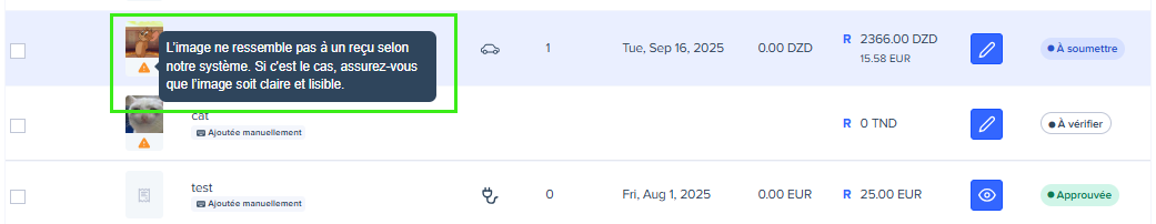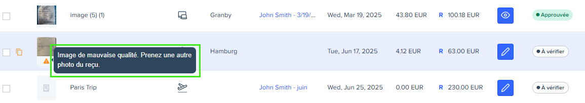 Expensya vérifie automatiquement la qualité et la validité de l'image du reçu. Si une anomalie est suspectée ou détectée, le système affiche une alerte dans la liste des dépenses et au sein de la dépense elle-même.