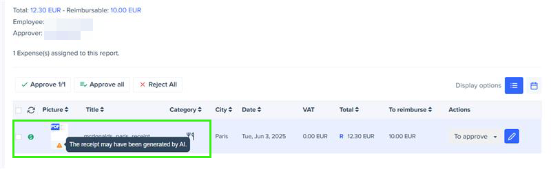 Lorsque un reçu semble être généré avec des outils d'IA, une alerte apparaît pour l'approbateur, le comptable et l'administrateur pour une vérification supplémentaire.