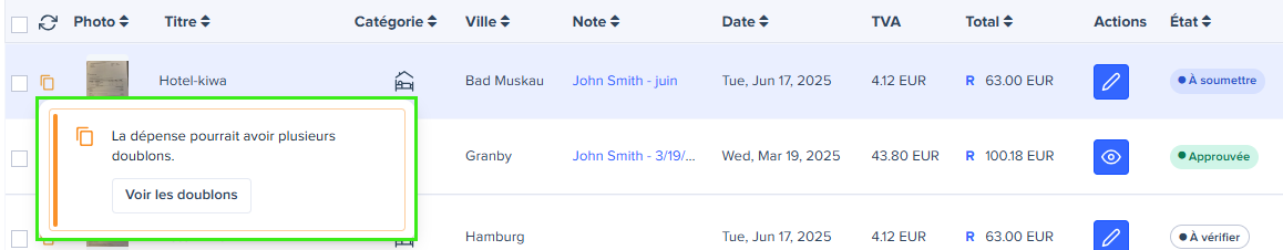 - Dépenses dupliquées – lorsqu’une nouvelle dépense correspond à une dépense existante.