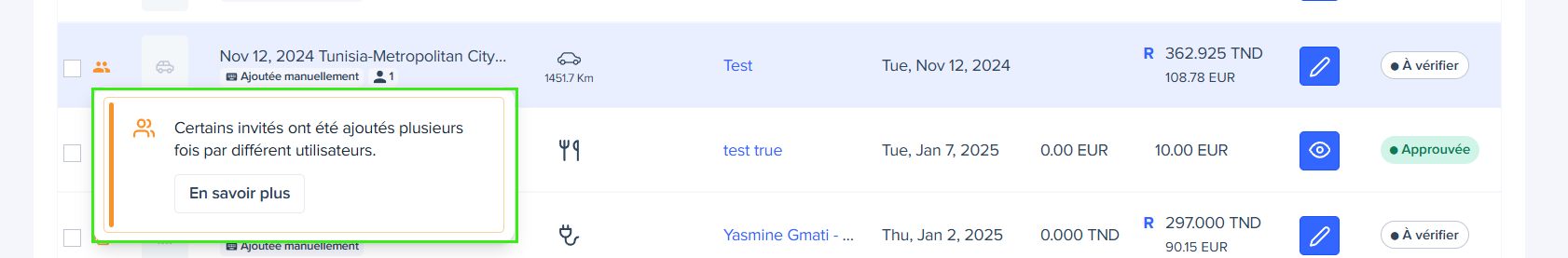 - Duplication des invités – lorsqu’un même invité est ajouté par différentes personnes dans des dépenses séparées.