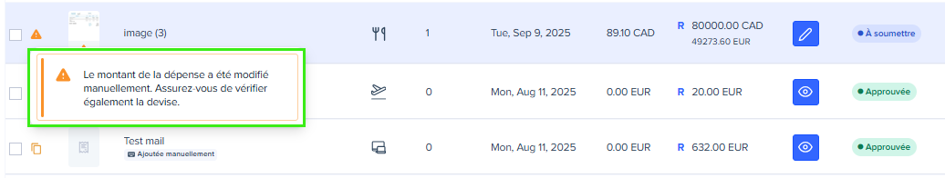 Lorsqu’un employé augmente manuellement un champ clé, comme le montant, la distance ou le taux de conversion, Expensya affiche une alerte à l’employé, à l'approbateur, au comptable et à l’administrateur. Cette alerte informe des modifications suivantes :