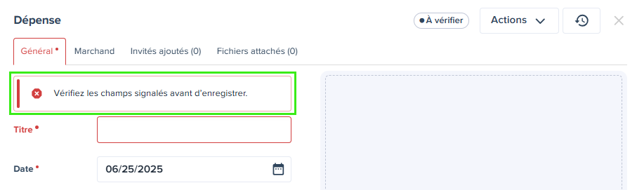 Lorsque des champs obligatoires sont manquants ou contiennent des erreurs, une alerte bloquante apparaît pour l’employé, l'approbateur, le comptable et l’administrateur jusqu’à ce que les corrections soient effectuées.