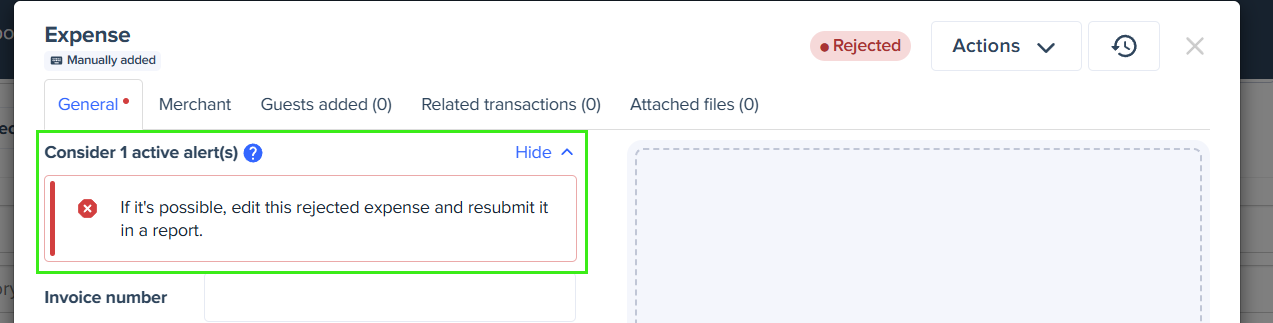 Lorsque l'image téléchargée est floue ou de mauvaise qualité pour être traitée, une alerte apparaît pour l'employé, l'approbateur, le comptable et l'administrateur.
