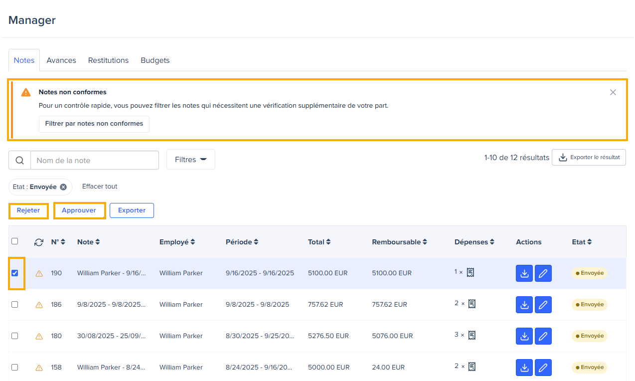 Vous pourrez contrôler les dépenses de chaque note, puis approuver la note en entier, partiellement ou bien la rejeter.